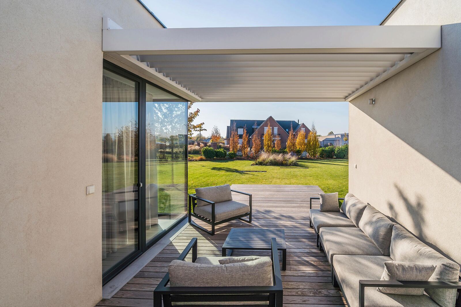 De Renson Aero is een ingebouwd lamellendak dat volledig geïntegreerd wordt in een vooraf voorziene dakstructuur of nis. Er zijn geen palen, geen zichtbare opbouw. Alleen een strak plafond met kantelbare lamellen dat naadloos opgaat in de architectuur van je woning.
