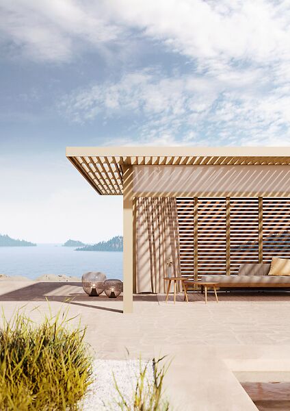De Renson Amani kan vrijstaand in de tuin geplaatst worden als zelfstandig geheel, maar evengoed tegen de gevel van je woning. In beide gevallen creëer je een rustige plek waar je volop kan genieten van je tuin en de natuur.