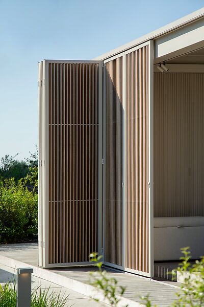 De Renson Amani wordt vaak gekozen in totaalprojecten waar tuin en woning één verhaal vormen. Het lamellendak werkt echter evengoed als uitbreiding van je bestaande terras.