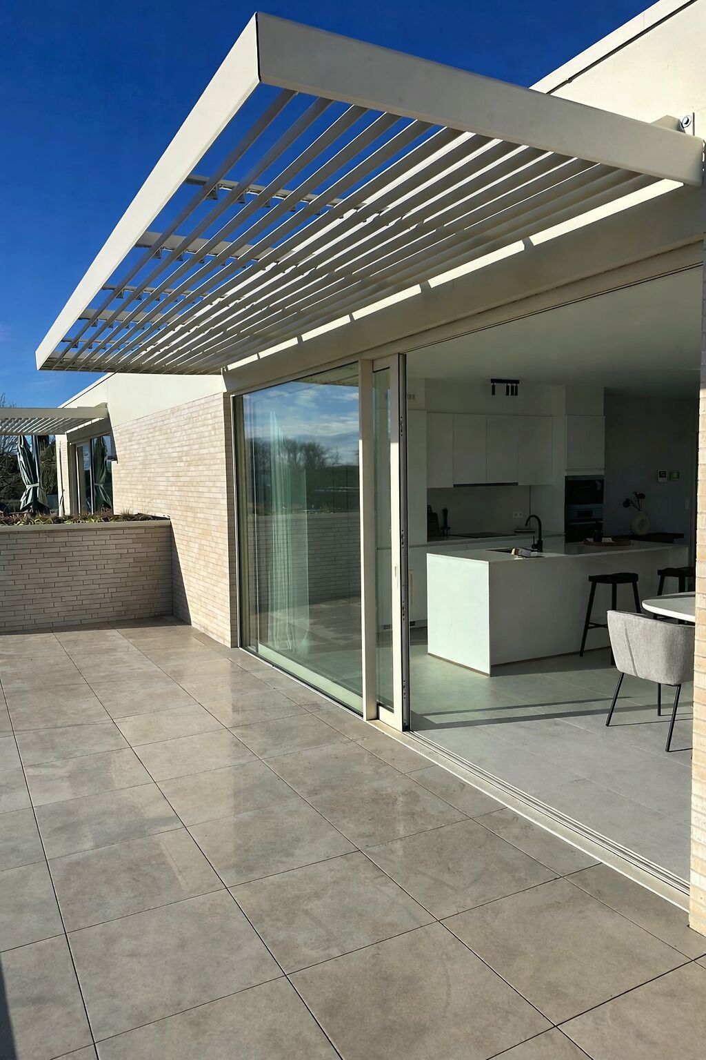 Door de vaste lamellen ontstaat een duurzame en esthetische zonwering die perfect aansluit bij hedendaagse architectuur.