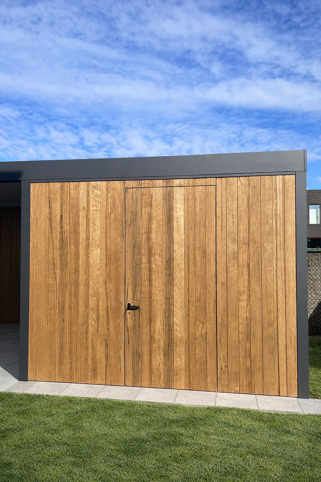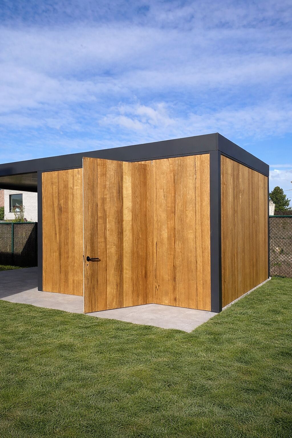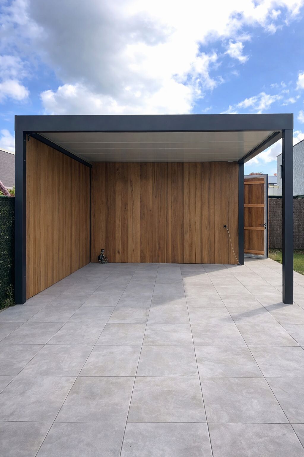 Deze realisatie toont een aluminium carport die werd uitgebreid met een geïntegreerde berging, afgewerkt met houten wanden in afrormosia. Het resultaat is een perfecte combinatie van strak aluminium design en een warme, natuurlijke uitstraling.