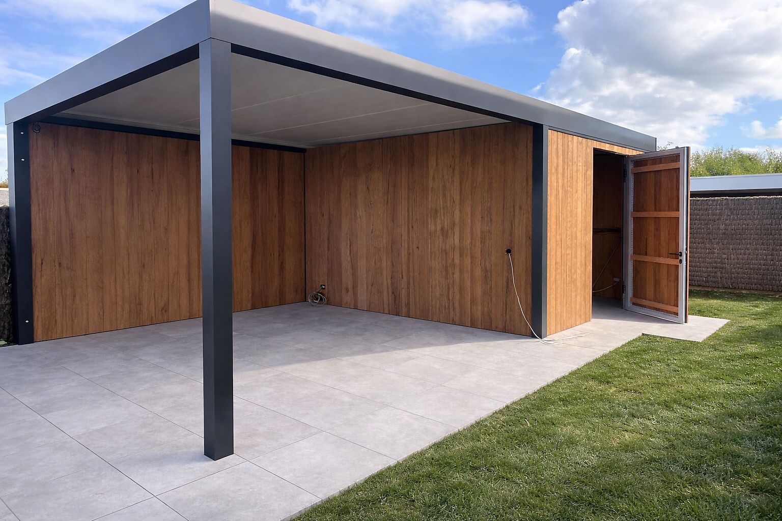 Deze realisatie toont een Alugance carport te Waregem die werd uitgebreid met een geïntegreerde berging, afgewerkt met houten wanden in afrormosia.