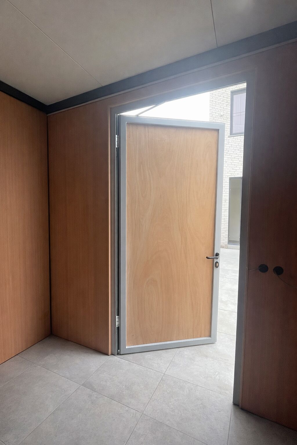 De toegang tot de berging gebeurt via een hoogwaardige Hörmann metalen deur met houten bekleding.