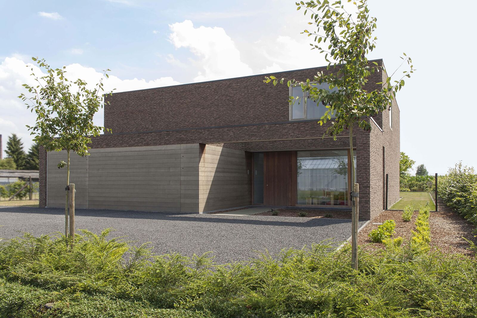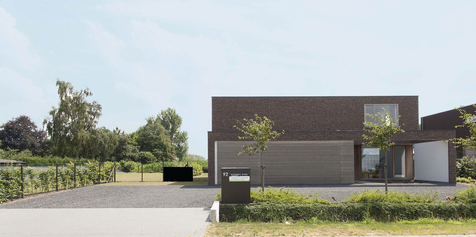 Het ontwerp van architect Dirk D'Hondt te Lokeren vertrekt vanuit twee verschoven volumes die samen een krachtig, maar tegelijk ingetogen geheel vormen. De woning sluit zich aan de straatzijde eerder af, terwijl ze zich aan de tuin volledig opent met grote glaspartijen en zicht op het landschap.