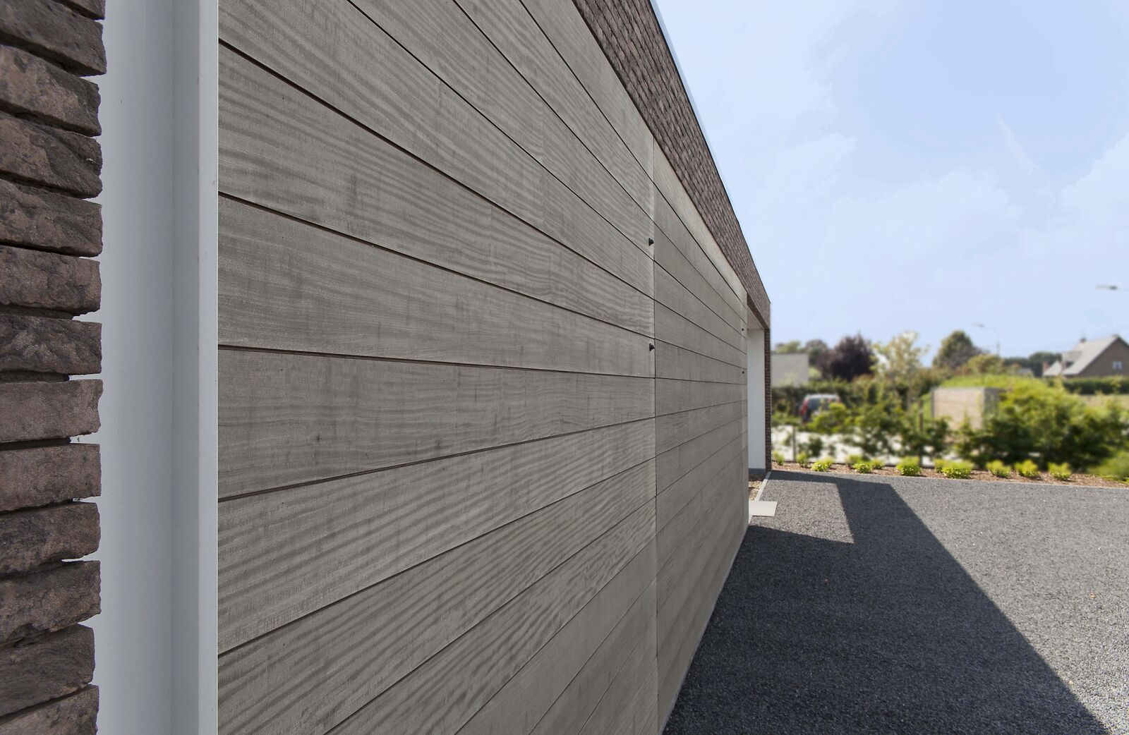 Bij deze realisatie draait alles om detail en afwerking. De integratie van de gevelbekleding in hout met de garagepoort vraagt om precisie en vakmanschap. Door te werken met kwalitatieve materialen zoals afrormosia en door de juiste technische opbouw te combineren met esthetiek, ontstaat een duurzame en onderhoudsvriendelijke oplossing.