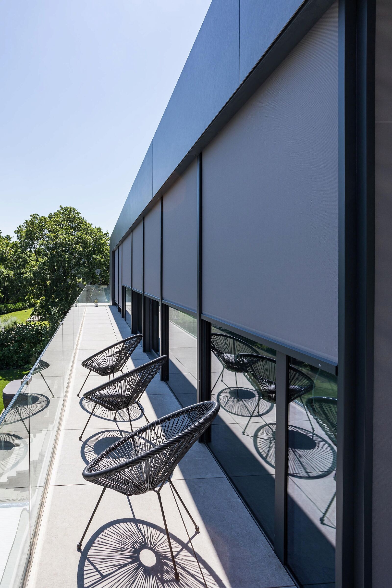 Rondom de terrasoverkapping werden bovendien hoogwaardige screens geïntegreerd. Deze zorgen voor een doeltreffende bescherming tegen rechtstreekse zonnestralen, waardoor het ook op warme en zonnige dagen aangenaam vertoeven blijft. De screens filteren het felle licht zonder het open karakter van de ruimte te verliezen.