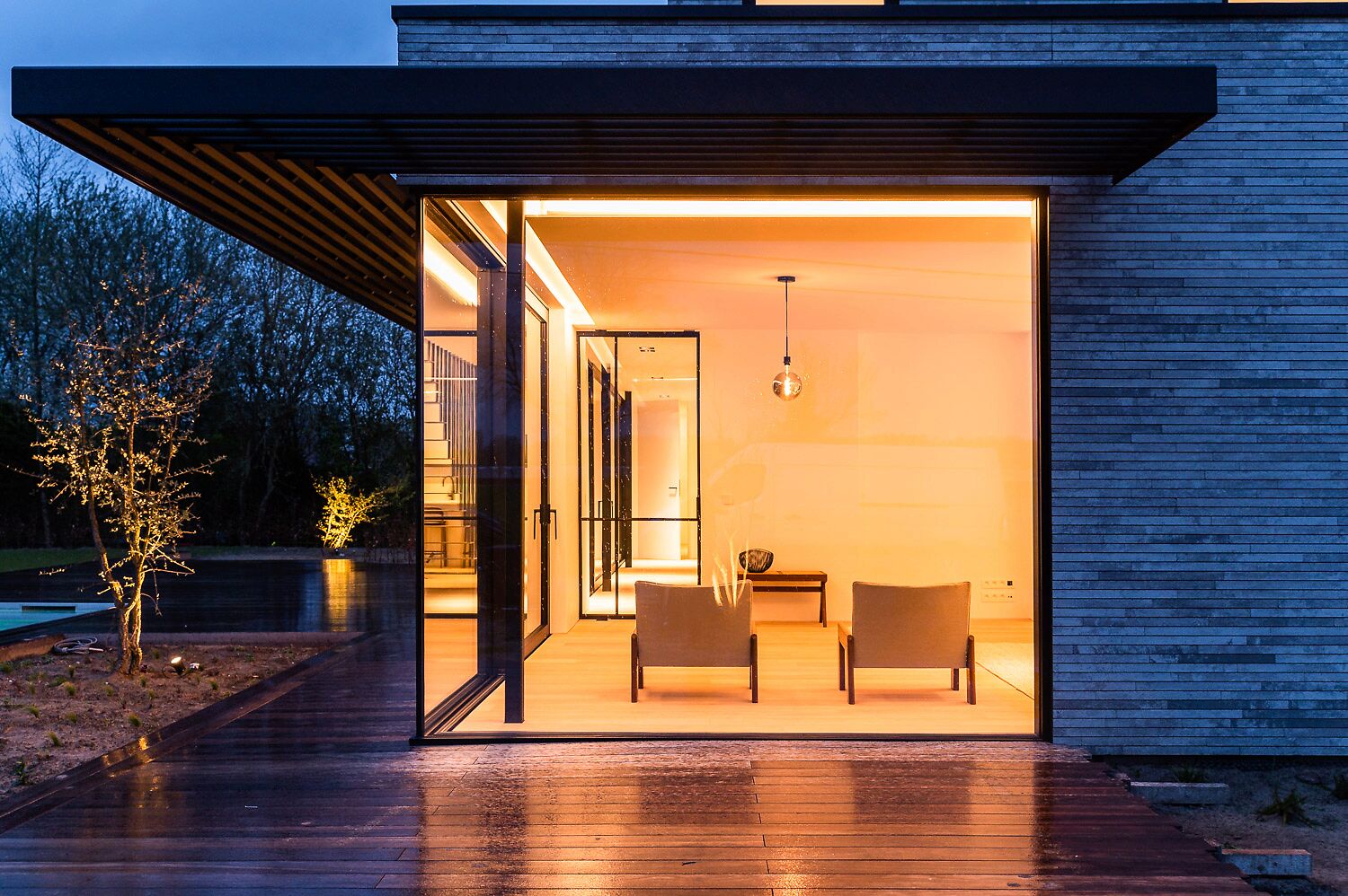 De horizontaal geplaatste lamellen vormen een architecturaal statement dat het strakke karakter van de villa versterkt. Dankzij hun vaste positie creëren ze tijdens de zomermaanden aangename schaduw, waardoor oververhitting van het interieur wordt beperkt. De directe zonnestralen worden tegengehouden nog vóór ze het glas bereiken, wat bijdraagt aan een comfortabel binnenklimaat en een lagere koelbehoefte.