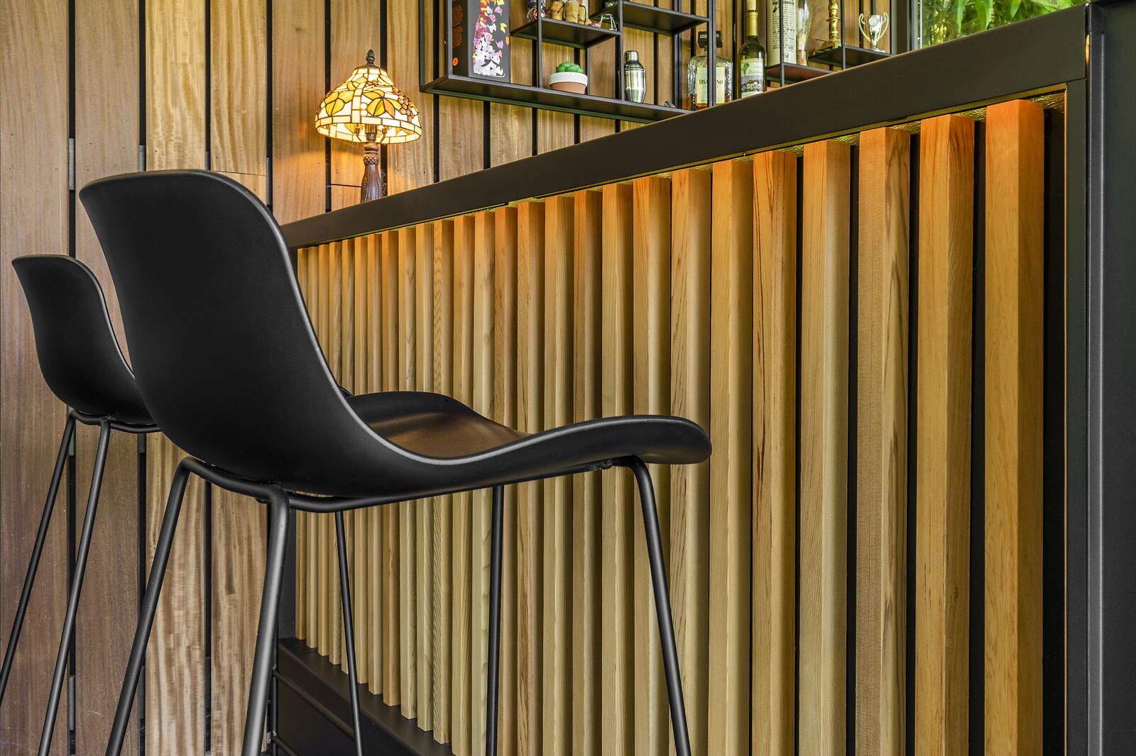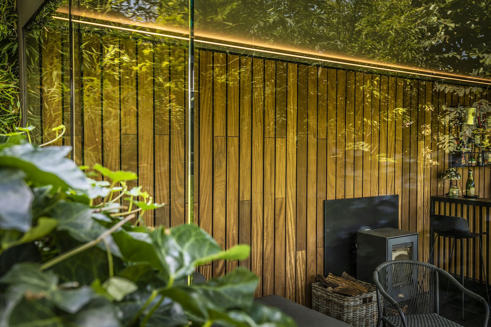 Een belangrijke eyecatcher binnen dit project is de vaste houten wand. Deze zorgt niet alleen voor beschutting, maar brengt ook een warme, natuurlijke sfeer in de ruimte.