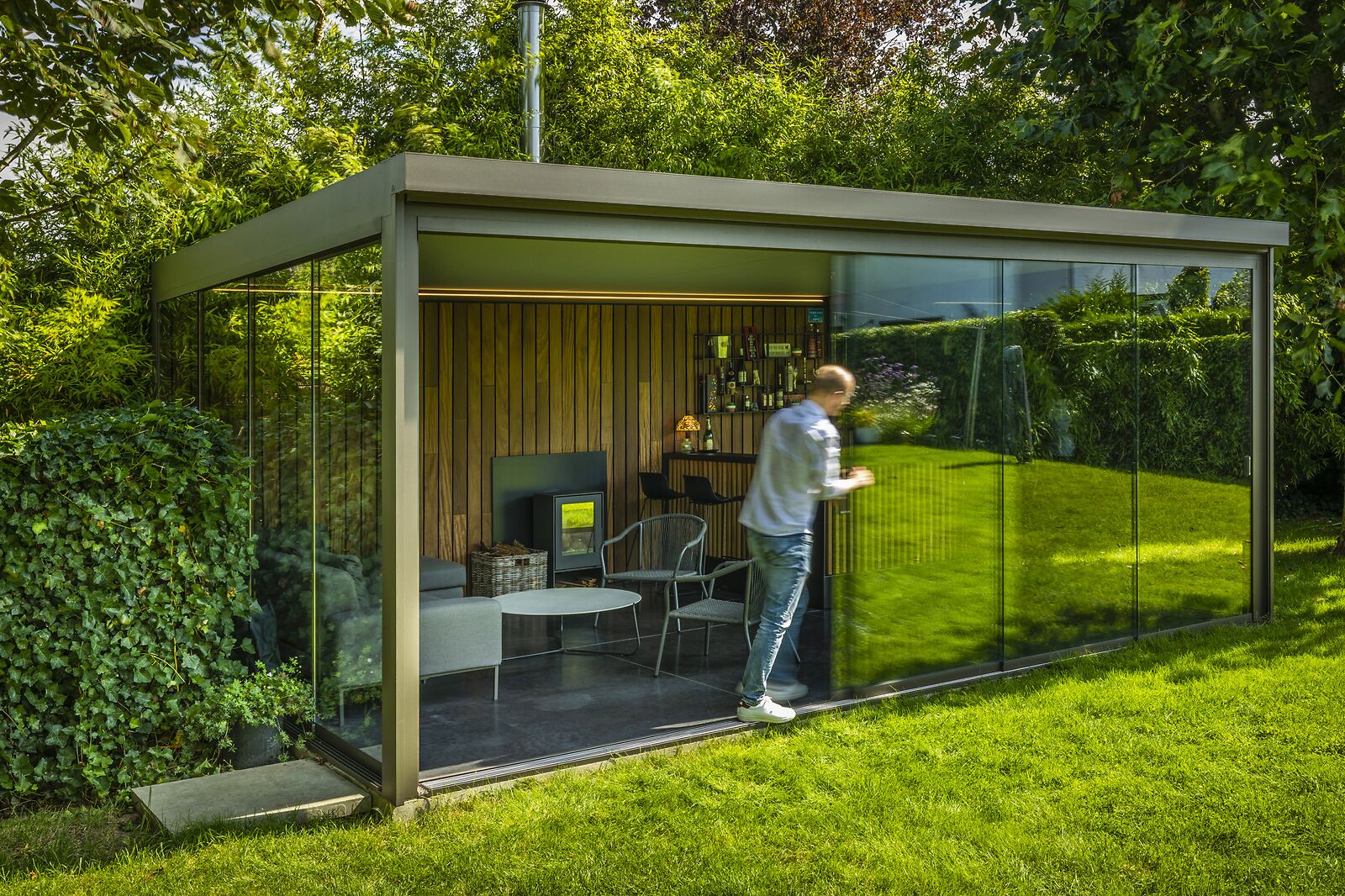 De strakke aluminium structuur van de terrasoverkapping vrijstaand vormt een modern architecturaal element dat tegelijk volledig opgaat in het groen van de tuin.