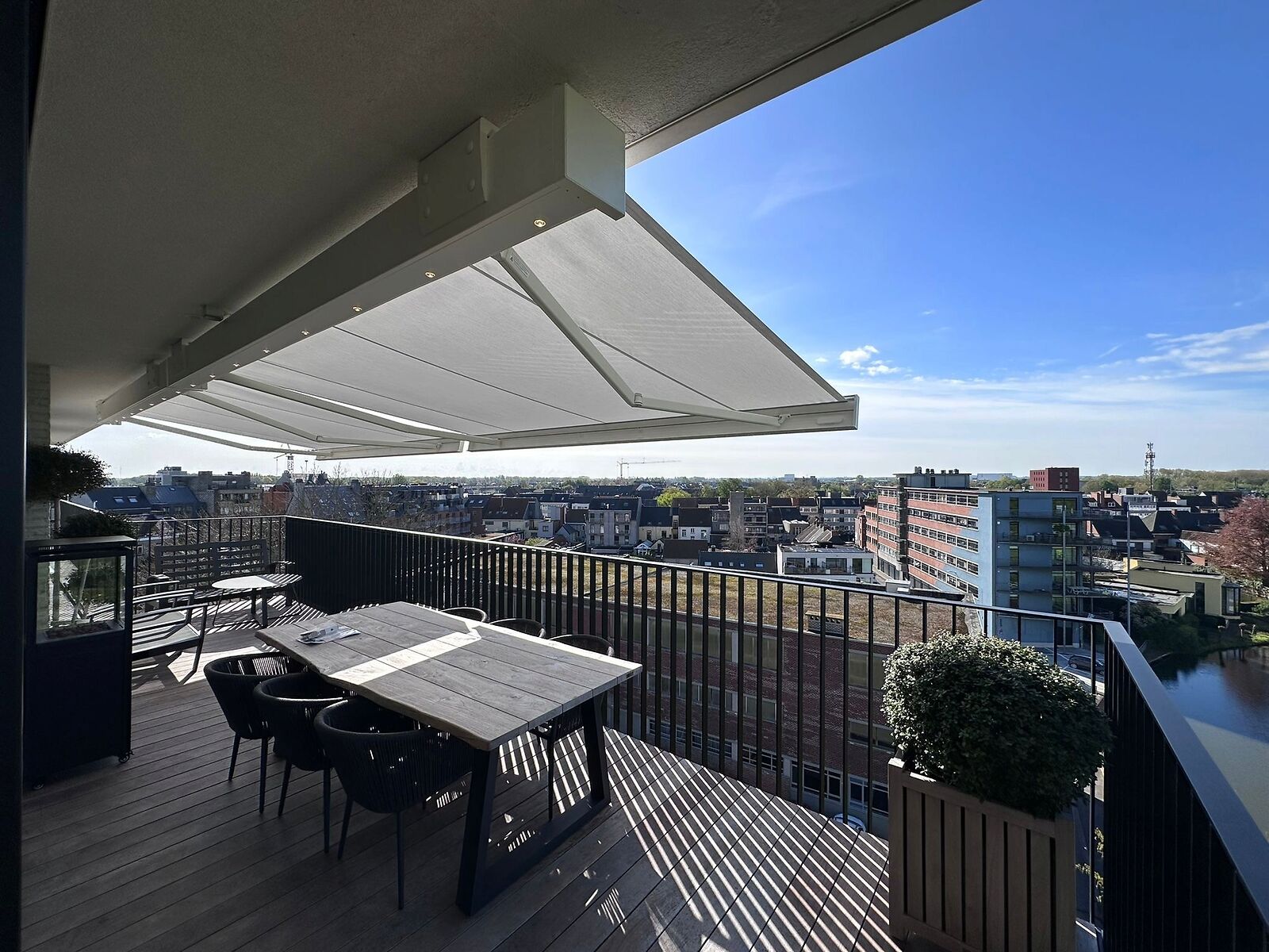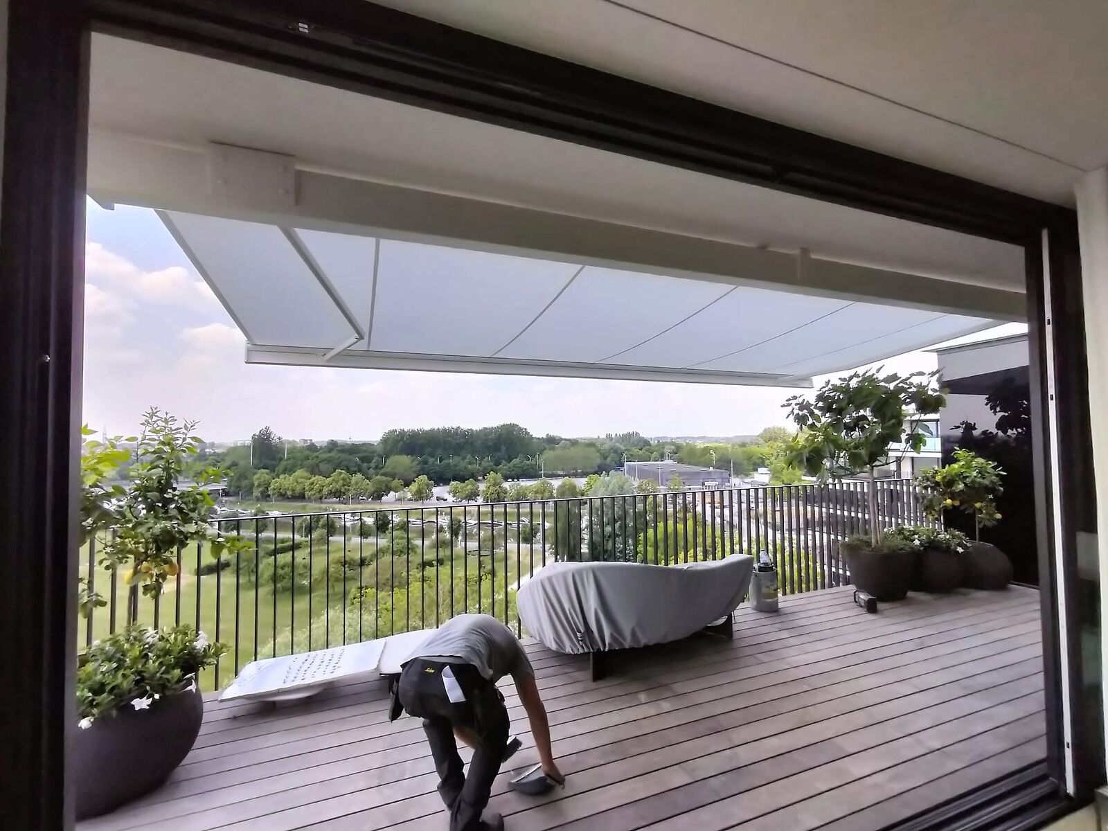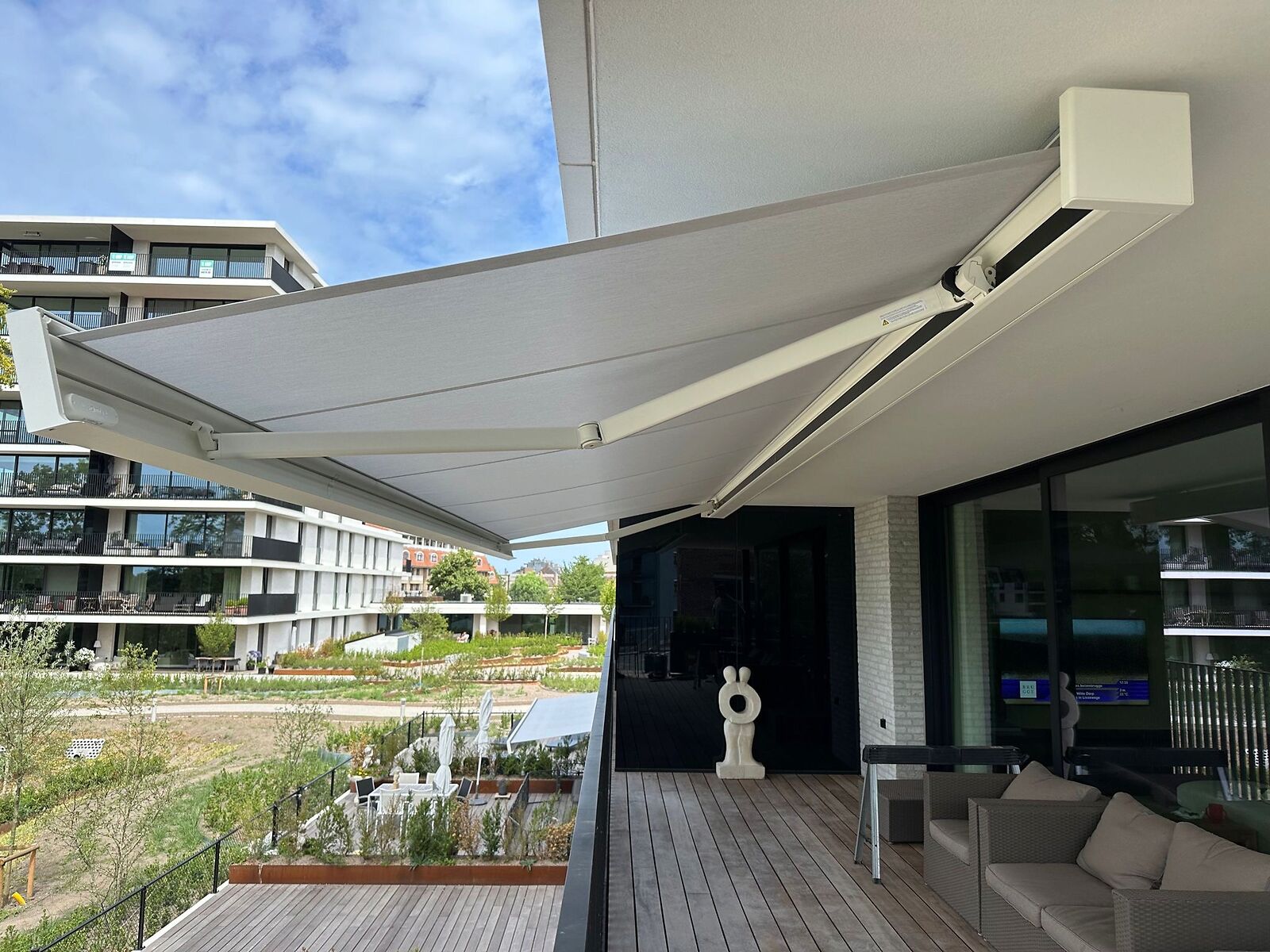 Het resultaat is een elegant en coherent geheel waarbij de zonneschermen voor terras en luifels voor terras geen storend element vormen, maar net bijdragen aan de architecturale kwaliteit.