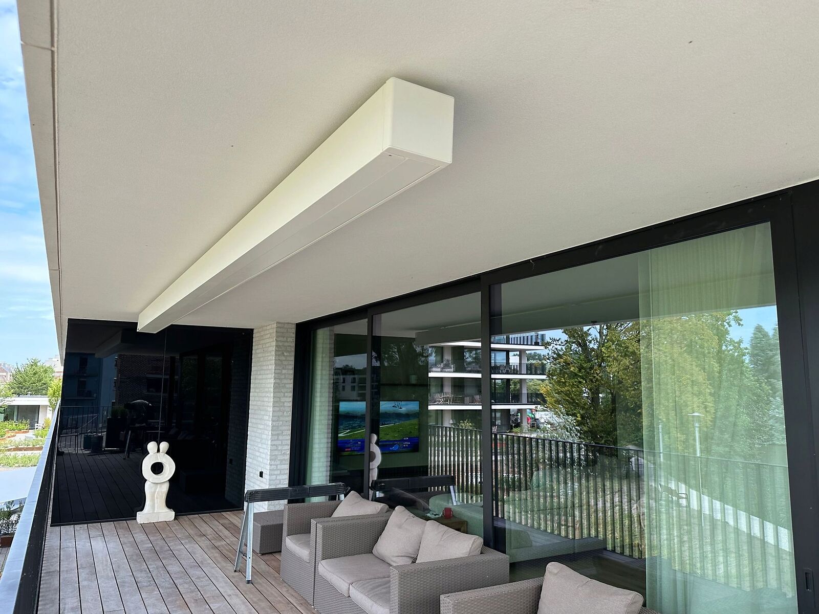 De zonneschermen werden opgehangen aan beugels tegen het plafond van de bovenliggende balkons. Dit zorgt voor:
