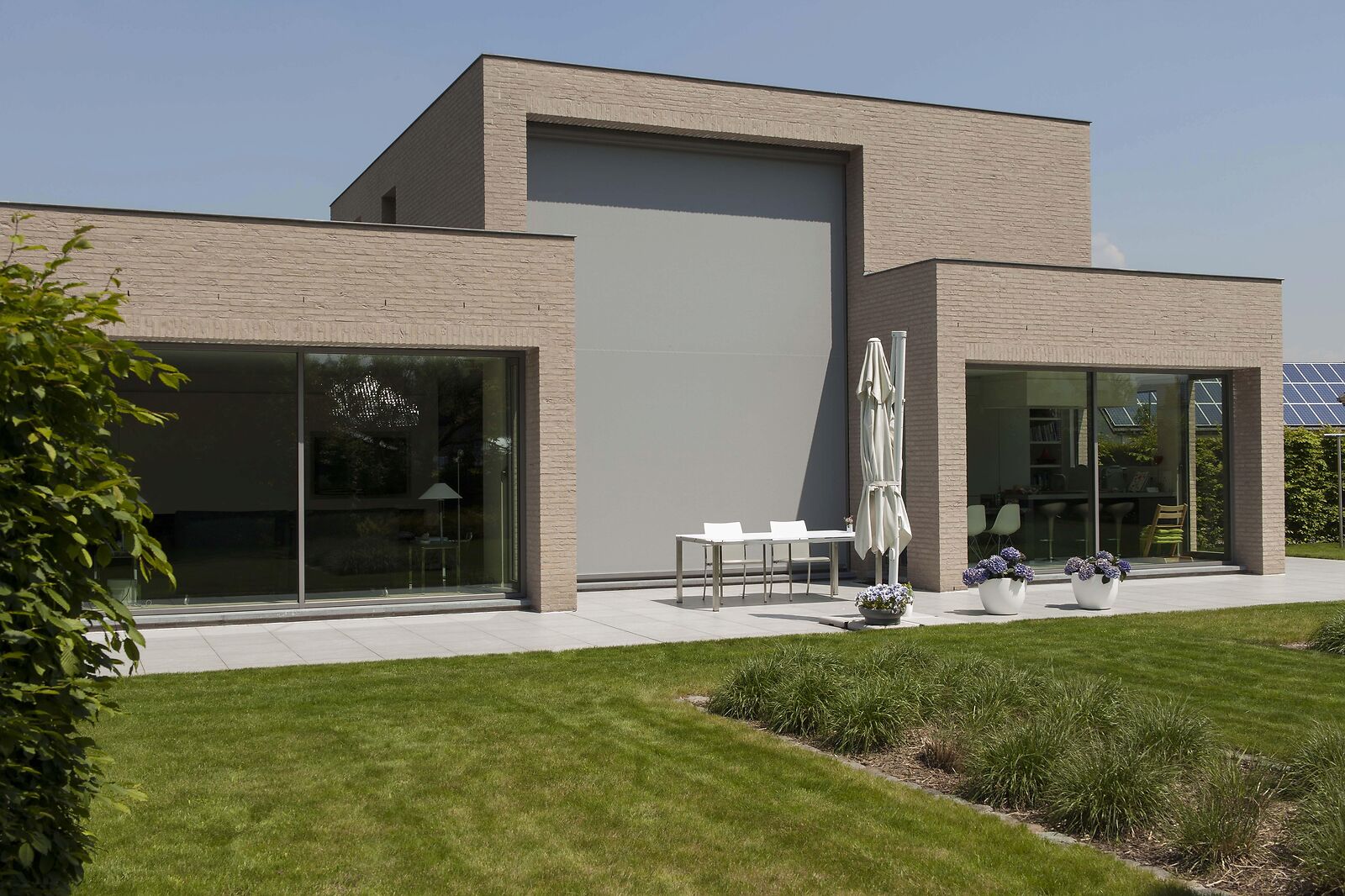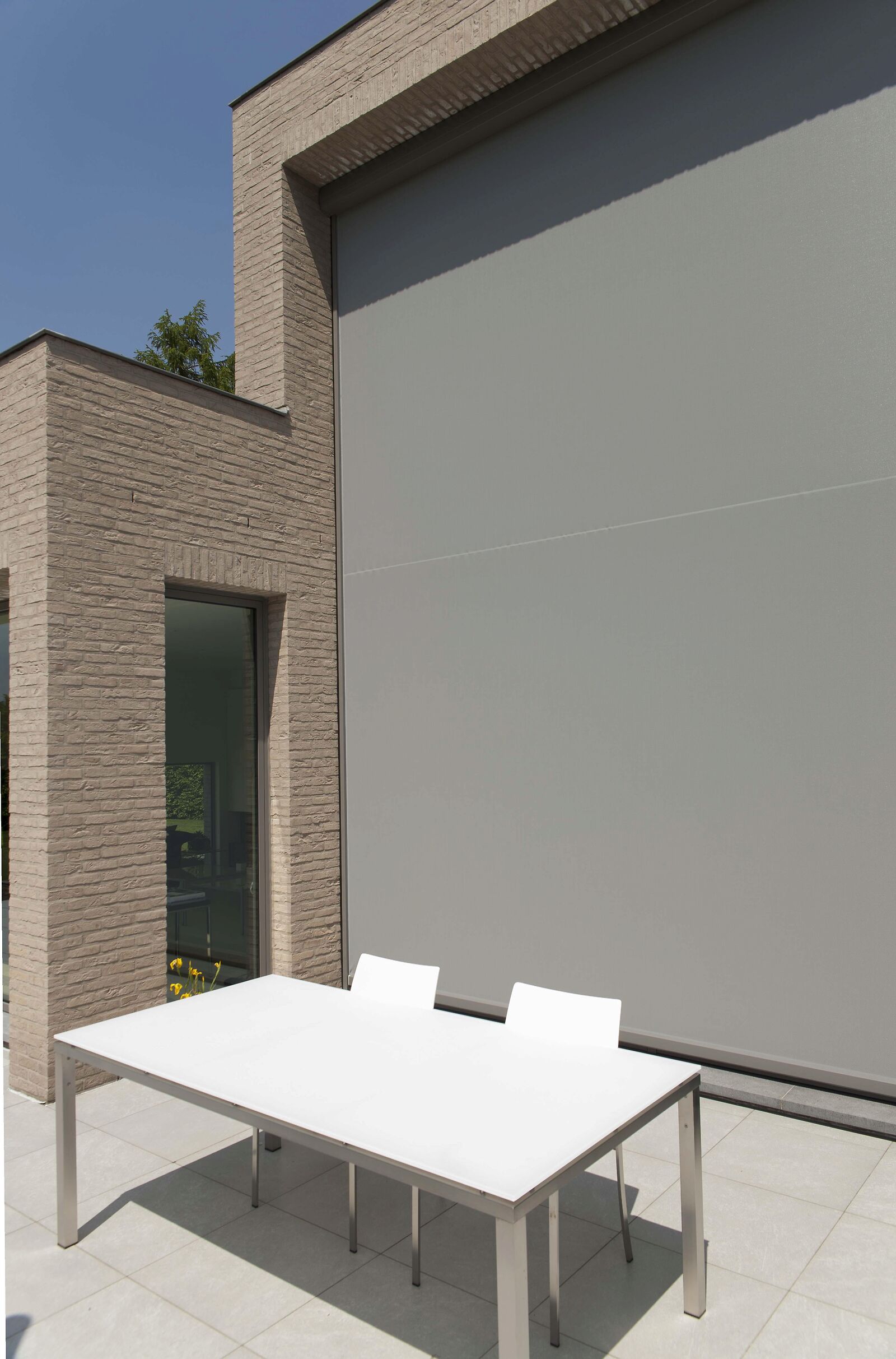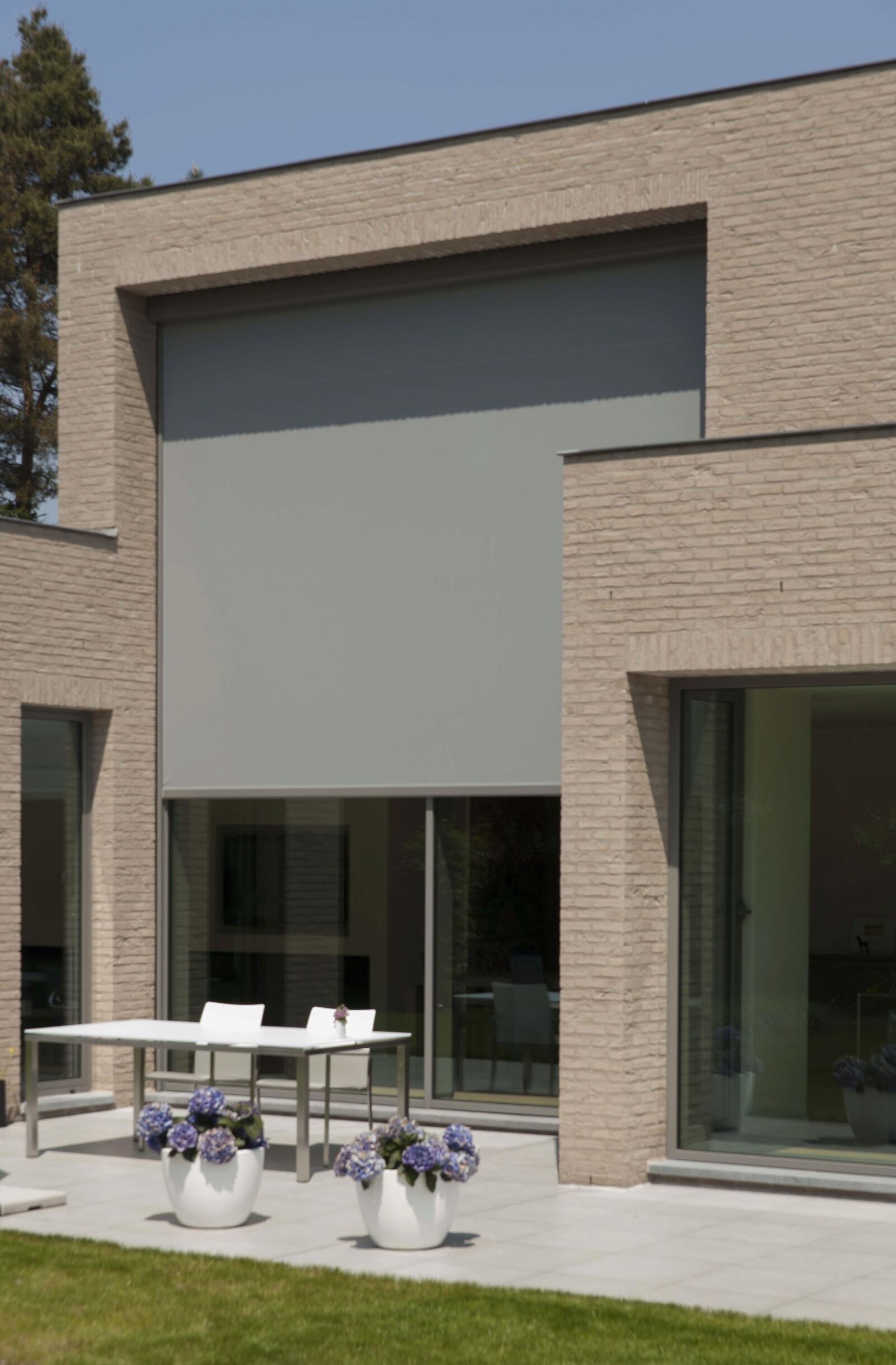 De aluminium onderdelen zoals kast, geleiders en onderlat werden gelakt in exact dezelfde kleur als het bestaande schrijnwerk. In combinatie met een grijs zonwerend doek voor buiten, perfect afgestemd op de ramen, ontstaat een zeer subtiel geheel.